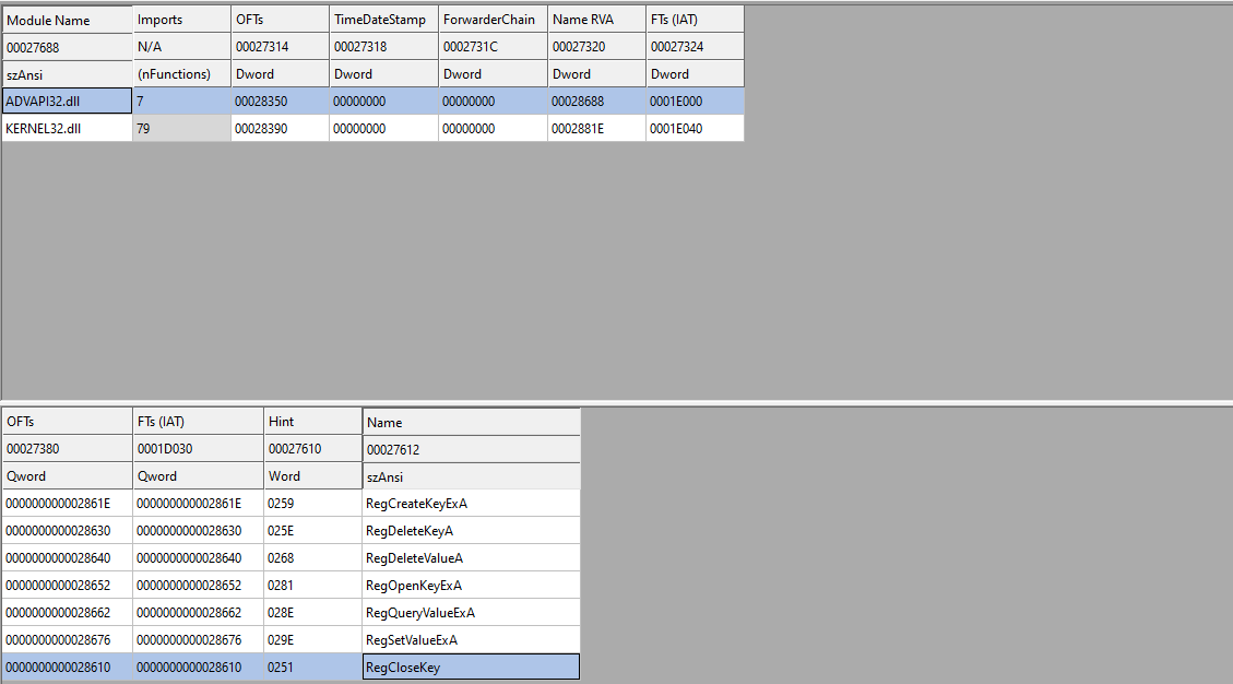 We can also confirm that the executable uses registry-related functions by looking at the IAT.