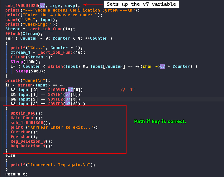 When I first had solved this, I didn’t bother checking for the v7 variable and instead vibecoded a script that bruteforces the character code, but it takes a few minutes since the executable uses sleep functions to delay it.