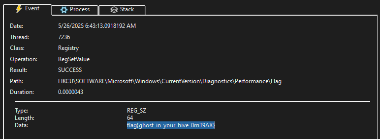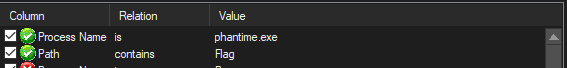 Given this information initially, we know that the executable stores the flag in some registry keys in the format flag{ghost_in_your_hive_%s}, all what’s missing now is to find the 4 character code, setup procmon64.exe and configure the filters to the executable and check for any registry changes.