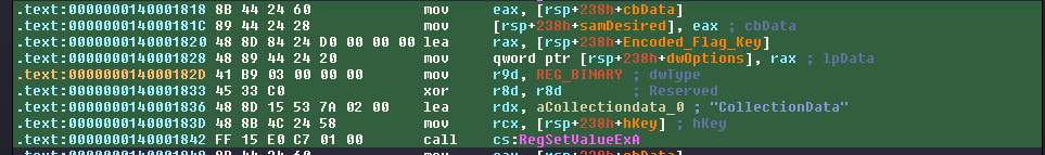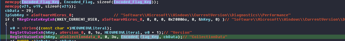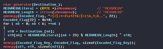 Then we see that it starts to setup what appears to be hardcoded encoded data and starts to XOR it with MEOWMEOW. Then it takes that encoded flag and passes it to the CollectionData key.