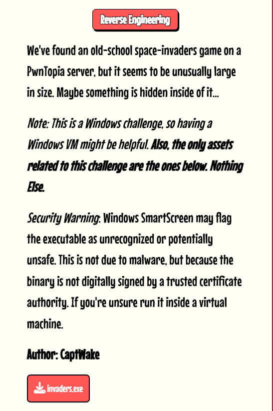 Opening the file; we’re presented with a mimic of space invaders that is completely playable, use the arrow keys to move and space bar to shoot.