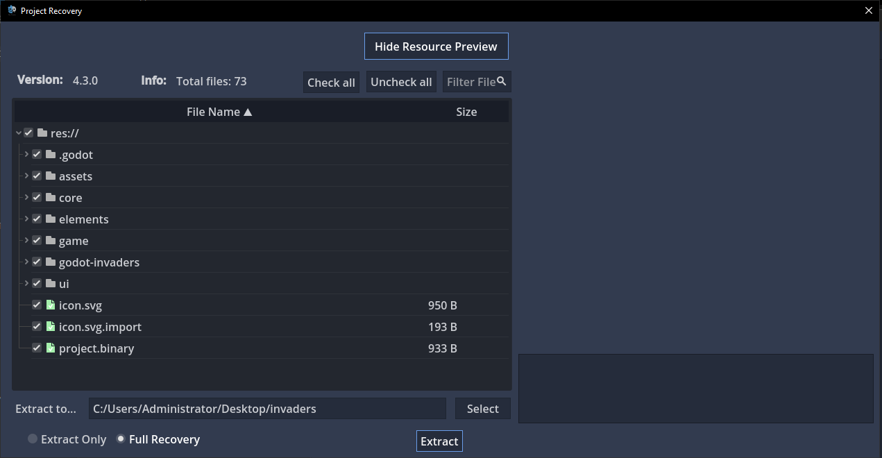 Putting our large executable in the tool, we can extract the GDScript script files (.gd)
