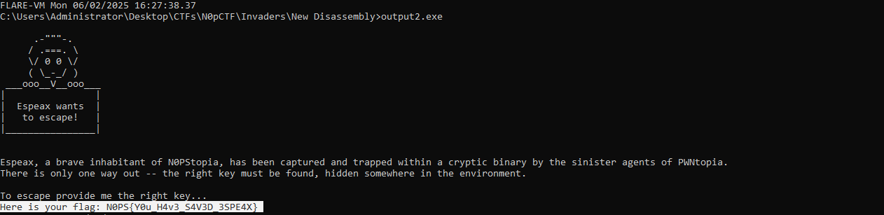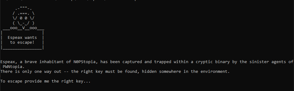 Upon execution, we’re greeted with some very cool ASCII art and then the program asks us to save Espeax from the evil cryptic binary!