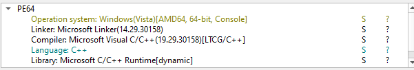 Using DiE, we are able to conclude that the executable is a C++ program, so we’ll see lots of name mangled functions.