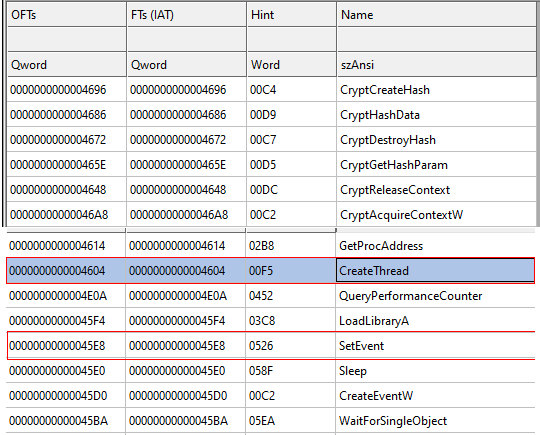 Checking the PE file for imports we see entries of Cryptography related functions from ADVAPI32.DLL