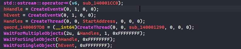 Then we create two threads objects that take StartAddress() and sub_140001290() respectively, lastly the main function will wait for both event objects to be set if we are to proceed execution of the main function, so our goal here is to analyze StartAddress