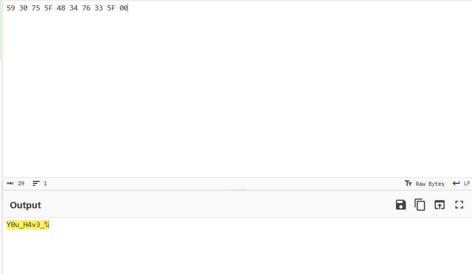 It prints out 59 30 75 5F 48 34 76 33 5F 00