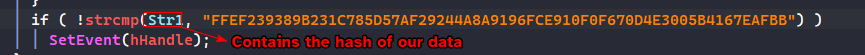 The remainder of this function basically takes the bytes after the forementioned loop and takes the SHA256 hash of it and then compares it to a hardcoded hash (which turns out to be itself) and if it’s equal: then we set the first event object.