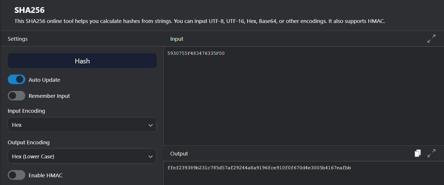 Putting the data into a SHA256 Hash tool online, we can see that the data’s hash is exactly the same as the hardcoded one, so we don’t need to do anything for StartAddress().