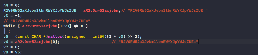 It proceeds to decode this base64 string (which is not really important to our analysis)