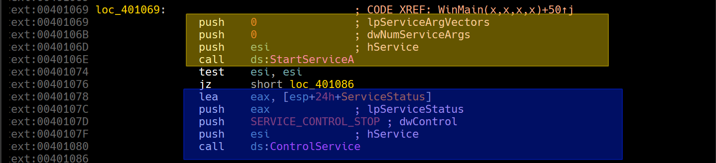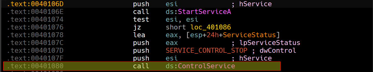 We’ll need to load up the program in IDA and see where the call to ControlService is made.