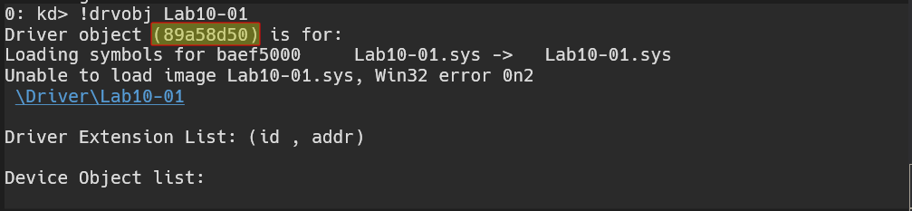 Now that we have obtained the name of this driver, we can then begin to find the address for that driver object by using !drvobj Lab10_01: