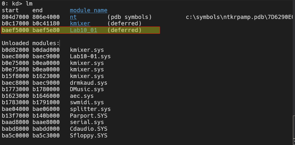 After breaking with the kernel debugger on our host, if we check the loaded modules, we can see a module called Lab10_01: