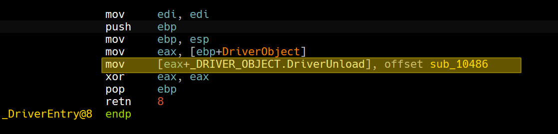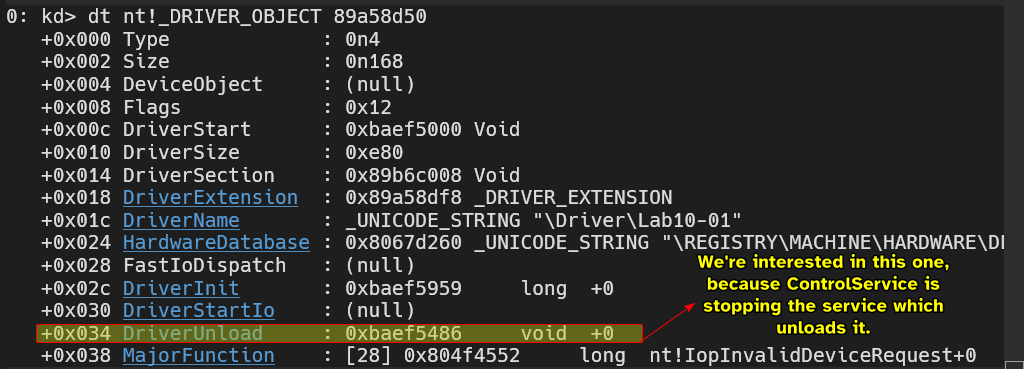 ControlServiceis used to stop the service used for the kernel driver, so we’ll have to look forDriverUnloadprocedure in theDRIVER_OBJECTstructure to see what executes when the driver is unloaded.