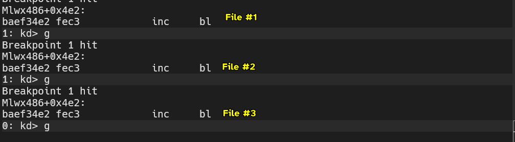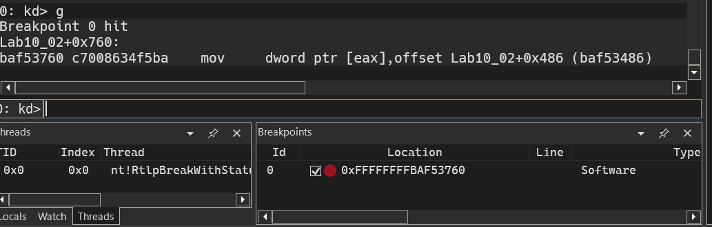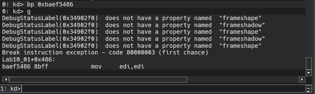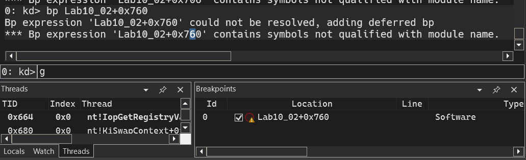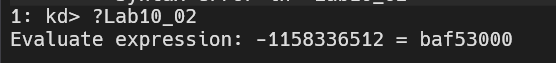 Lab10-02+0x760, it won’t work as Windbg evaluates hyphens as underscores.