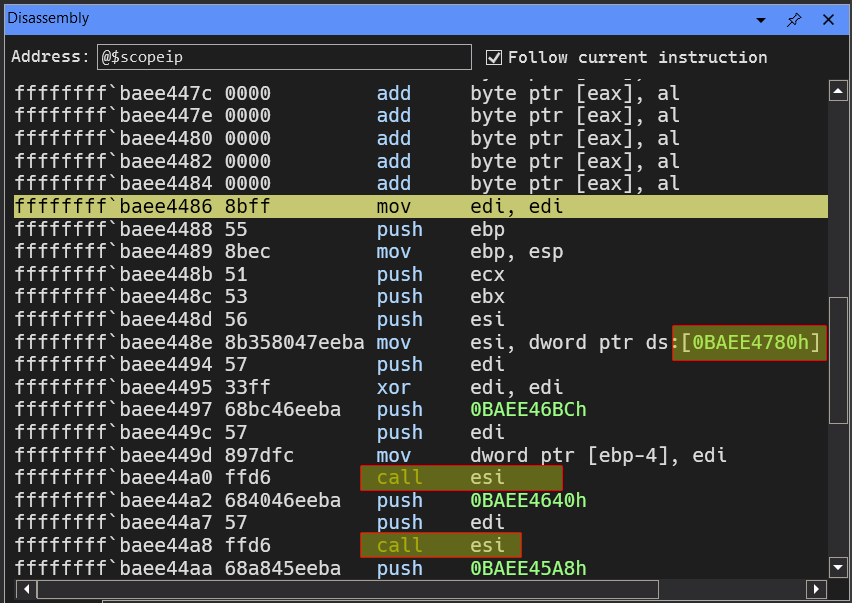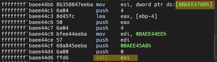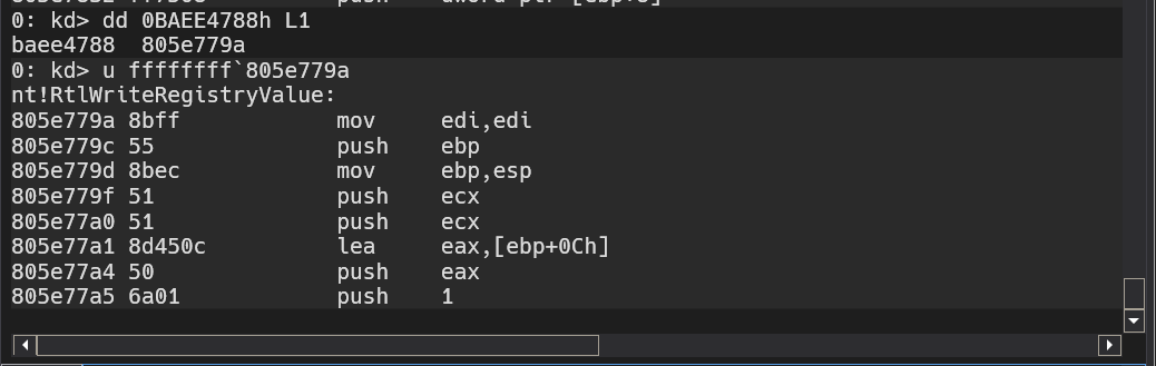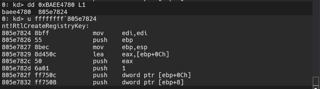 We can see that the driver is loading some function pointer at 0xBAEE4780 and then calls it later on, we can obtain that pointer by doing dd 0xBAEE4780 L1 and obtain the pointer and from there disassemble using u.