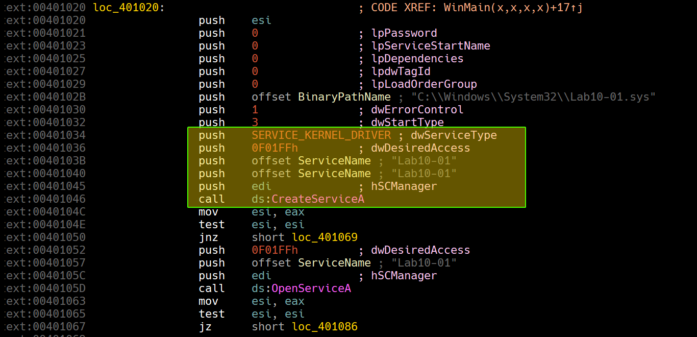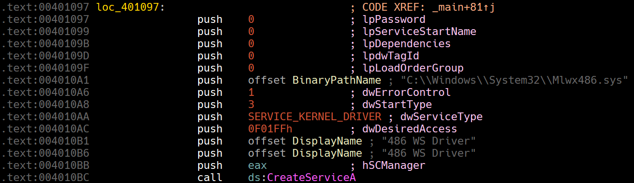 If we continue analyzing the user-mode component after the file creation, we can see that it begins creating a service of type SERVICE_KERNEL_DRIVER called 486 WS Driver: