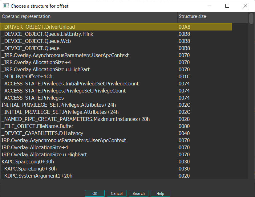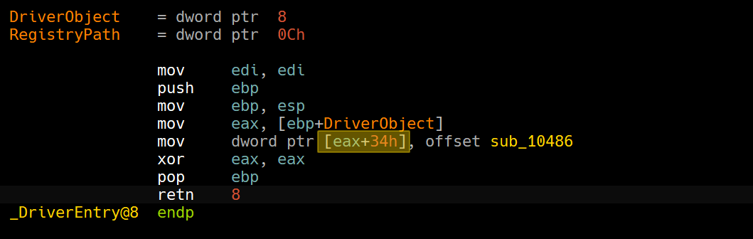 ntapiandntddkloaded, you can apply a structure to theeax+34hexpression so it appears as an offset to theDriverObjectstructure by clicking T and then applying the suitable member.