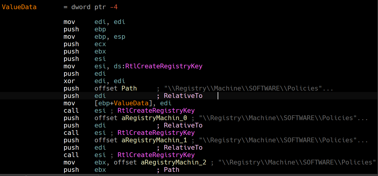 We can see that the function called is actually nt!RtlCreateRegistryKey, and later on in the code, we see a similar pattern for a different function:
