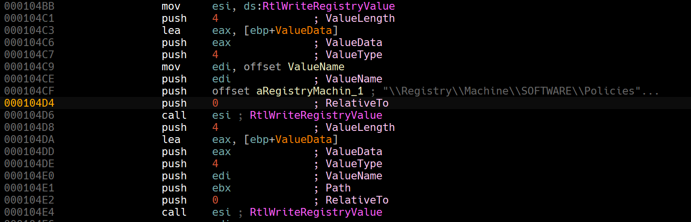Then we can see uses of RtlWriteRegistryValue: