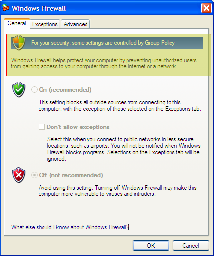 And indeed, if we try to enable Windows Firewall, we get the following error message.