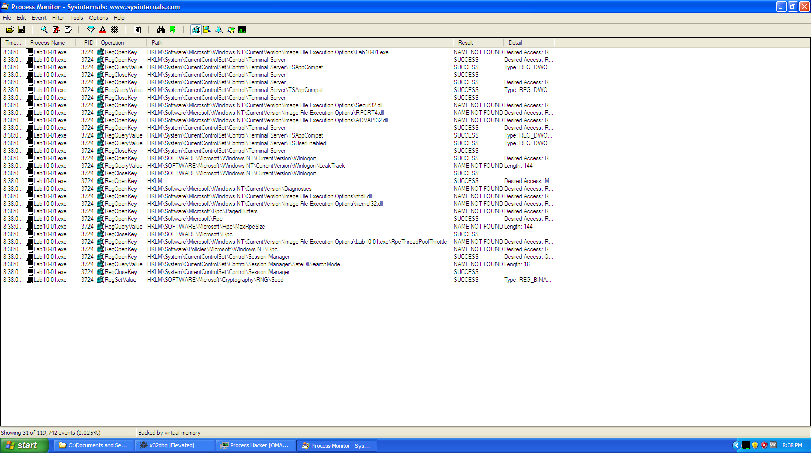 Since we know that Lab10-03.exe is running an infinite loop as shown in the disassembly, we don’t see it appearing in the process listing of Process Hacker or any process listing program for that matter.
