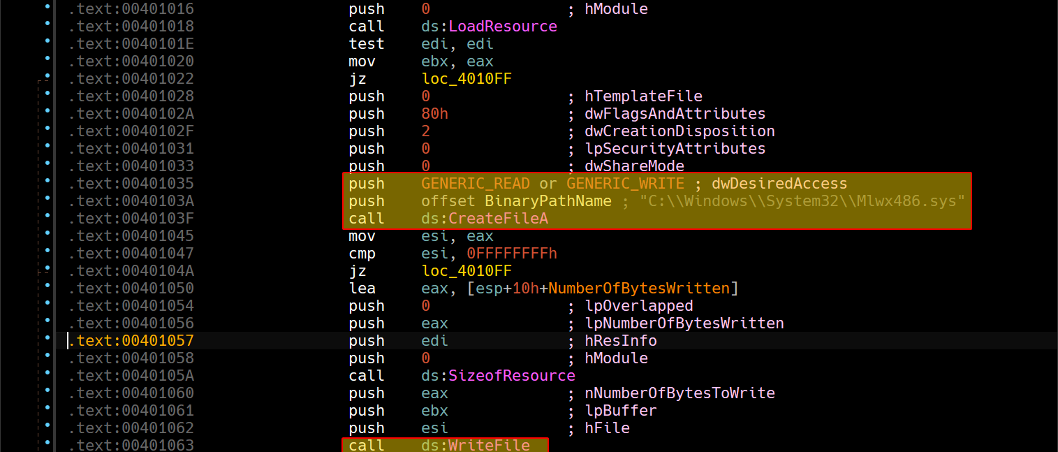 Then if it is found, it begins creating a file in the system directory called Mlwx486.sys with GENERIC_READ | GENERIC_WRITE access and writes the resource content to the file.