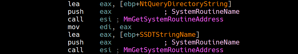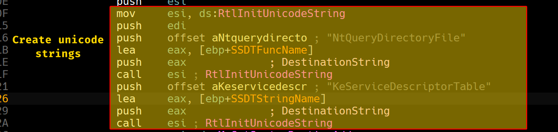 We can see that it begins creating two UNICODE_STRING structures that contain both NtQueryDirectoryFile and KeServiceDescriptorTable.