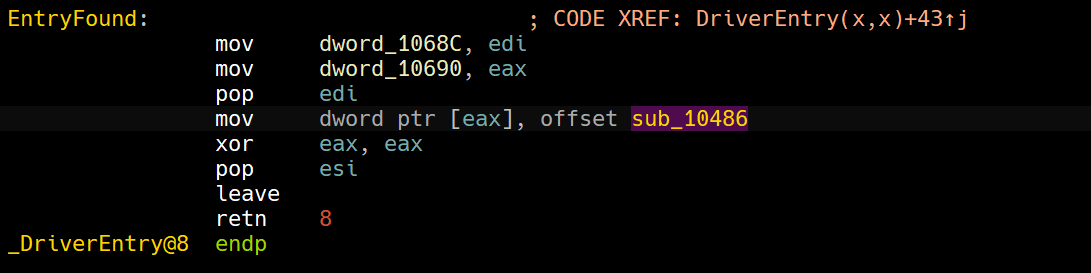 This matches up with what we’ve been looking at in the kernel debugger, so we’ll turn our focus to sub_10486.