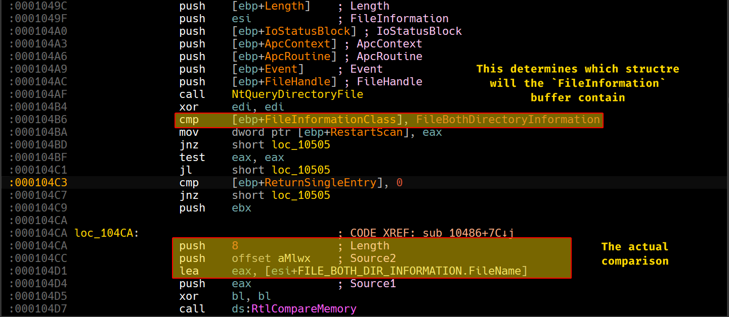 It begins by calling NtQueryDirectoryFile normally, but it compares the first 8 bytes of the filename queried to a hardcoded string Mlwx.