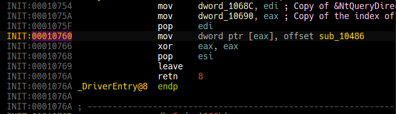 Then the driver begins iterating through all the entries starting from the SSDT and check if they match the address of NtQueryDirectoryFile.