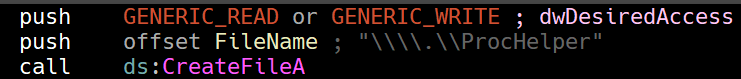 Then the program obtains a file handle to a device object in the Win32 namespace called ProcHelper with GENERIC_READ and GENERIC_WRITE access.