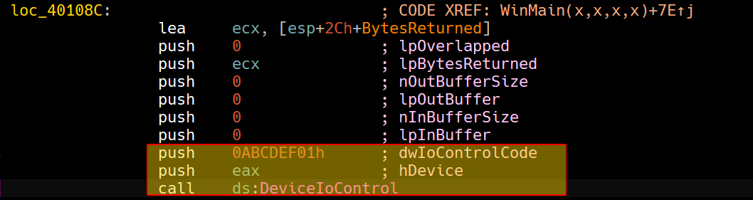 Then it sends a control code 0xABDEF01 to the driver so that DriverObject->MajorFunction[0xe] would execute in kernel space.