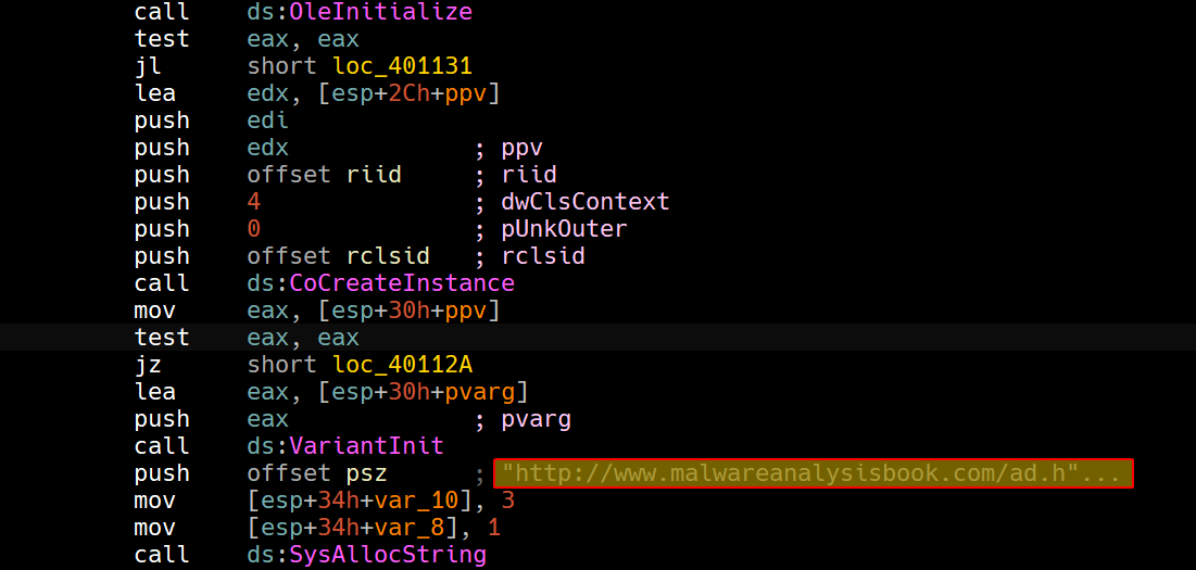 Then it begins creating an OLE instance, and we can also see a URL reference, indicating that this might be creating an Internet Explorer instance.