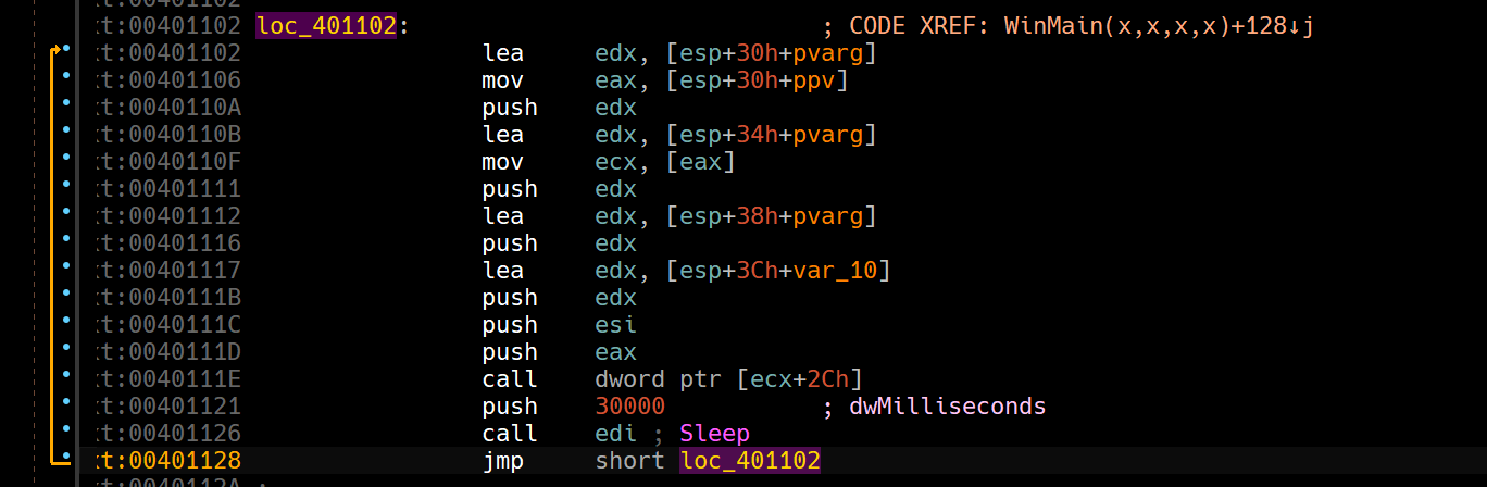 Then we can see that it begins looping over a block of code which is indicative that it’ll go to this website every 30 seconds, so we suspect that the usermode process will stay running indefinitely.