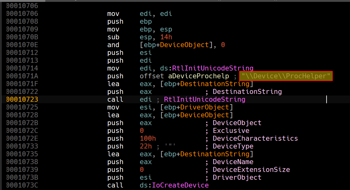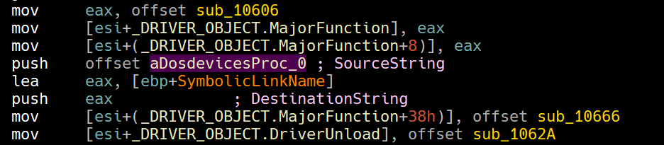 Examining the kernel driver statically provided to us, we can see that the driver actually creates a device object for user mode applications to communicate to, if they ever wish to communicate to the kernel driver.