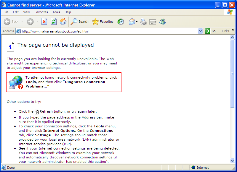 So in conclusion, the user mode component initializes, sets up and triggers a kernel mode component that does “something” and then keeps popping up Internet Explorer instances going to http://www.malwareanalysisbook.com/ad.html.