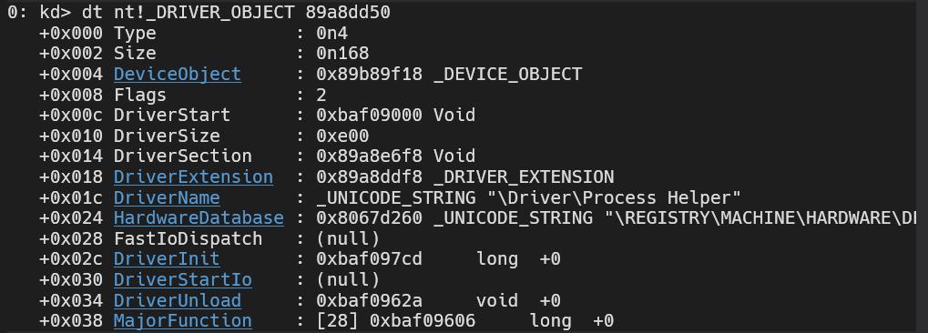 Now that we have obtained the address, we can apply the nt!_DRIVER_OBJECT datatype to that address and check for important info, including the function that executes when the driver’s loaded, unloaded, etc..