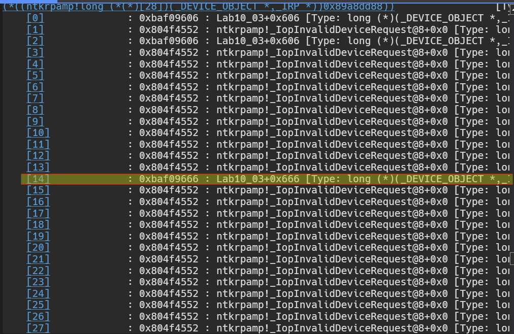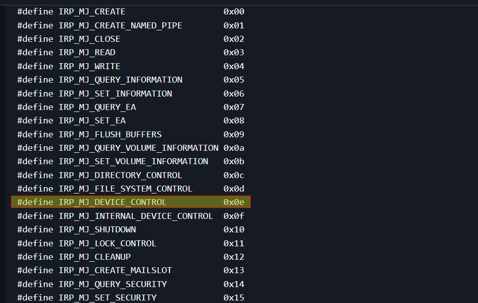 We know thatIRP_MJ_DEVICE_CONTROLis the0xeindex of the array, and per the documentation of the_DRIVER_OBJECTstructure, we know thatMajorFunction[28]is at offset0x38, now since we move0x38away fromMajorFunction, we can translate this into the index it refers by doing this simple formula:0x38 / 0x4(each pointer is 4 bytes), we get0xe, we do the same calculation for eachMajorFunctionreference.