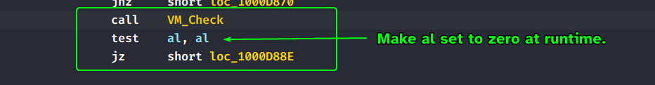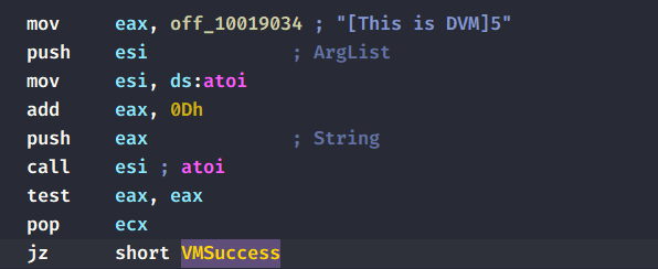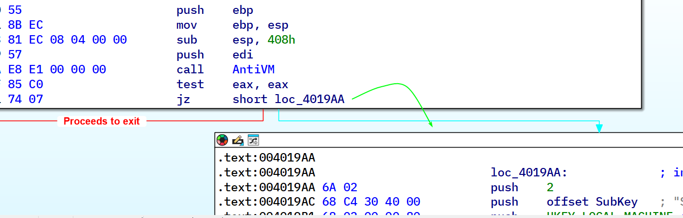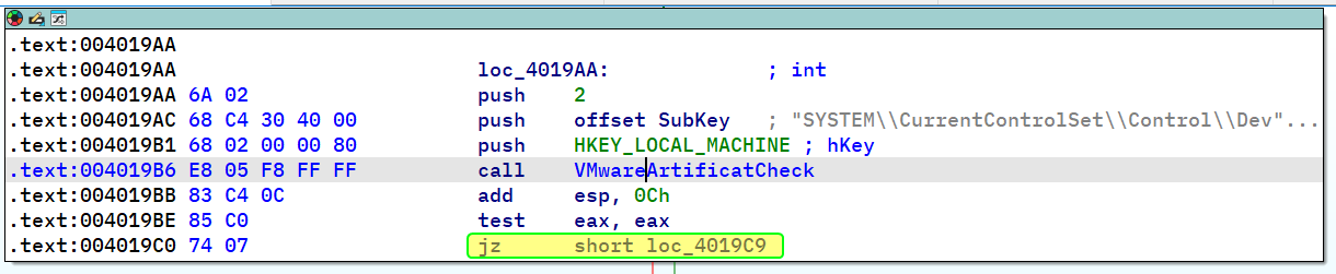 VMSuccess is the same label that the malware jumps to if it passes the Anti-VM check.