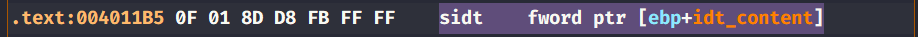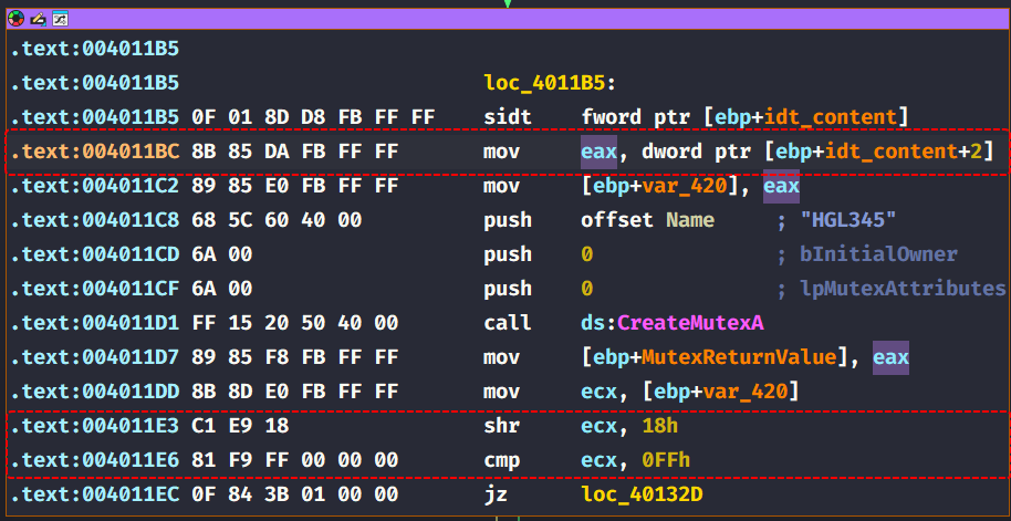 At address 4011B5, we can see an sidt instruction that fetches the IDTR’s content and stores it in memory.The 5th byte of the content is compared to 0xFF which can determine if the malware is running on a single processor virtual machine.