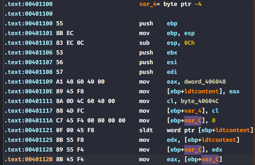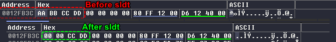 sldt instruction: This is the No Pill technique for Anti-VM which checks if the LDT (Local Descriptor Table) has a nonzero value (for VMs, it differs from real machines that normally return zero), in our case, it returns zero.