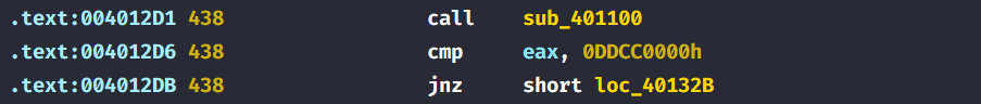 At address 401121 of sub_401100, we see an sldt instruction which is used to load the local descriptor table content into a variable and then returns the variable content.The malware then takes the value and compares it with 0DDCC0000h to determine if it is running in a VM.