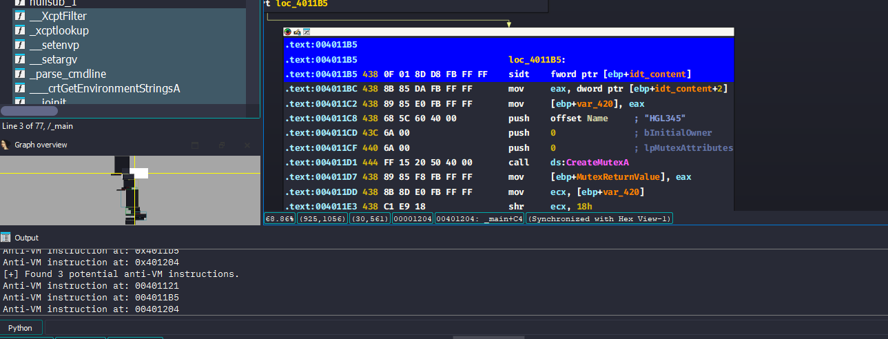 import idaapiimport ida_segmentimport ida_bytesimport ida_uaimport idautilsea = idaapi.get_screen_ea()seg = ida_segment.getseg(ea)start = seg.start_eaend = seg.end_eaanti_vm_instructions = {"sidt", "sgdt", "sldt", "smsw", "str", "in", "cpuid"}anti_vm_hits = []for head in idautils.Heads(start, end): if ida_bytes.is_code(ida_bytes.get_flags(head)): mnemonic = ida_ua.print_insn_mnem(head) if mnemonic in anti_vm_instructions: anti_vm_hits.append(head) print(f"[+] Found {len(anti_vm_hits)} potential anti-VM instructions.")for ea in anti_vm_hits: idaapi.set_item_color(ea, 0xFF0000) print(f"Anti-VM instruction at: {ea:08X}")