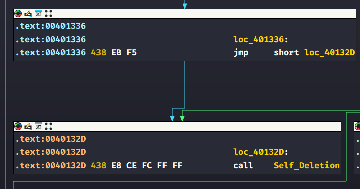 If any of the techniques succeed, the malware jumps to a label that in turn jumps to a call instruction whose target is a function that deletes the malware from the system, specifically sub_401000.