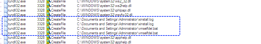 We can see that the malware creates 2 files in the home directory of the user, namely: xinstall.log and vmselfdel.bat