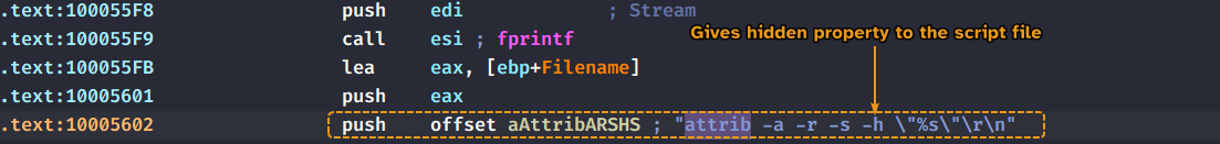 We see that the function sub_10005567 responsible for creating vmselfdel.bat actually gives a hidden attribute to the file using the attrib batch command.