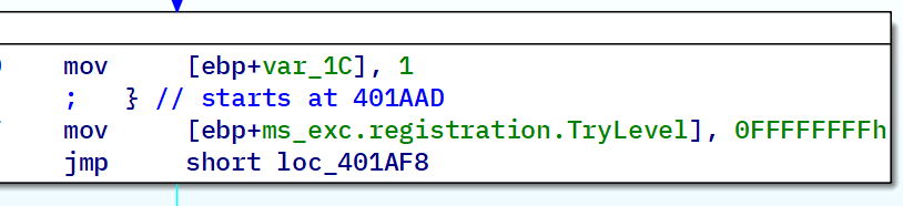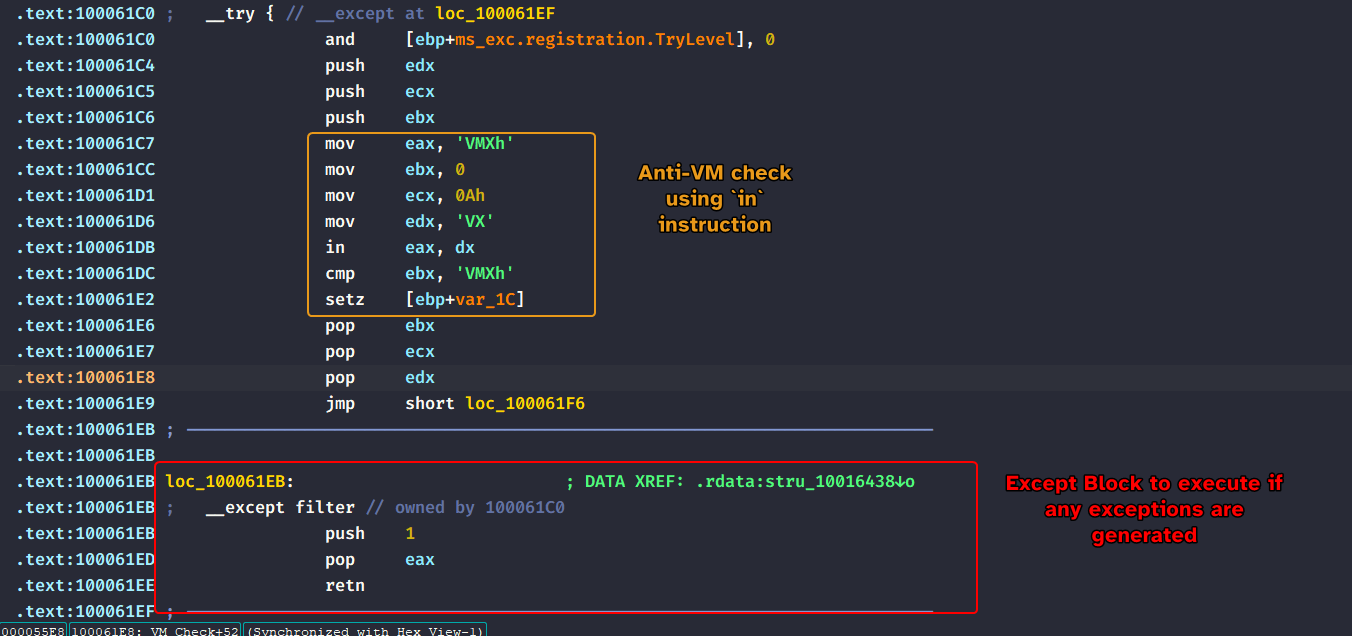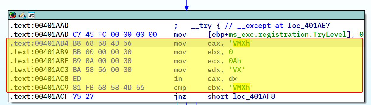 Analyzing the _main method of the malware, we can see that it calls sub_401A80 that basically queries the VMware communication port which is a common anti-VM technique in a try-catch statement and returns 1 if it is in a VM and 0 if otherwise, the main function then takes the return value and decides whether to exit or not.