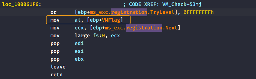 If the EBX register contains the value VMXh then the malware sets a dummy variable to zero and then moves that dummy variable into al as a return value for the function.