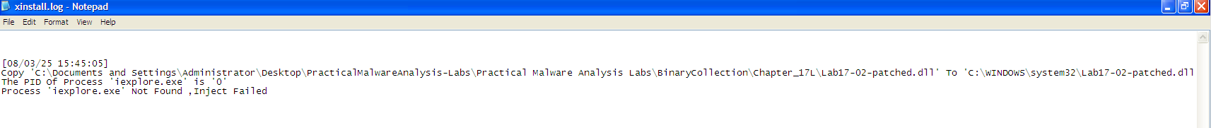 @echo off:selfkillattrib -a -r -s -h "C:\Documents and >Settings\Administrator\Desktop\PracticalMalwareAnalysis-Labs\Practical Malware Analysis Labs\BinaryCollection\Chapter_17L\DLLLoader32_C4A2.exe"del "C:\Documents and Settings\Administrator\Desktop\PracticalMalwareAnalysis->Labs\Practical Malware Analysis >Labs\BinaryCollection\Chapter_17L\DLLLoader32_C4A2.exe"if exist "C:\Documents and Settings\Administrator\Desktop\PracticalMalwareAnalysis->Labs\Practical Malware Analysis >Labs\BinaryCollection\Chapter_17L\DLLLoader32_C4A2.exe" goto selfkilldel %0